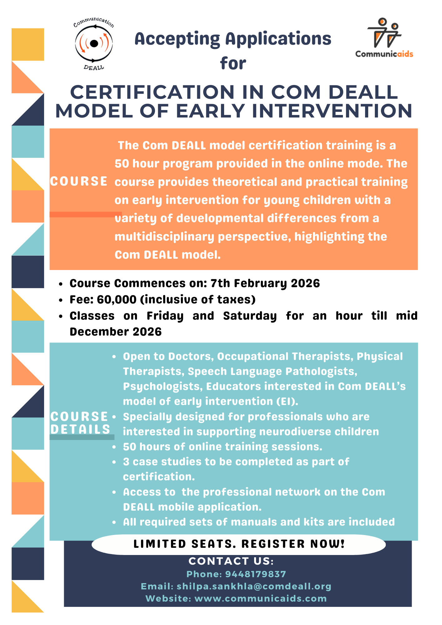 - Open to Doctors, Occupational Therapists, Physical Therapists, Speech Language Pathologists, Psychologists, Educators interested in Com DEALL’s model of early intervention (EI).